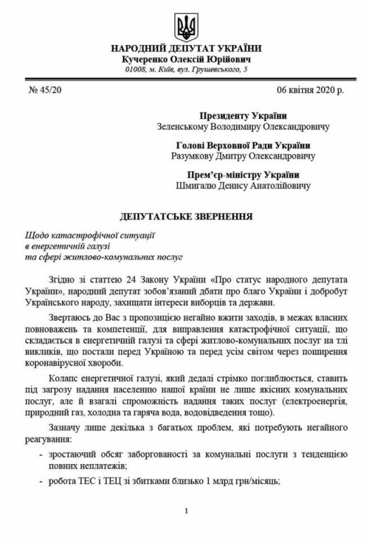 Після ретельного аналізу ситуації прийняв рішення звернутися з відкритим листом до Президента, Голови Уряду та Голови ВРУ стосовно ситуації в енергетичному та комунальному комплексі країни.