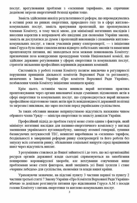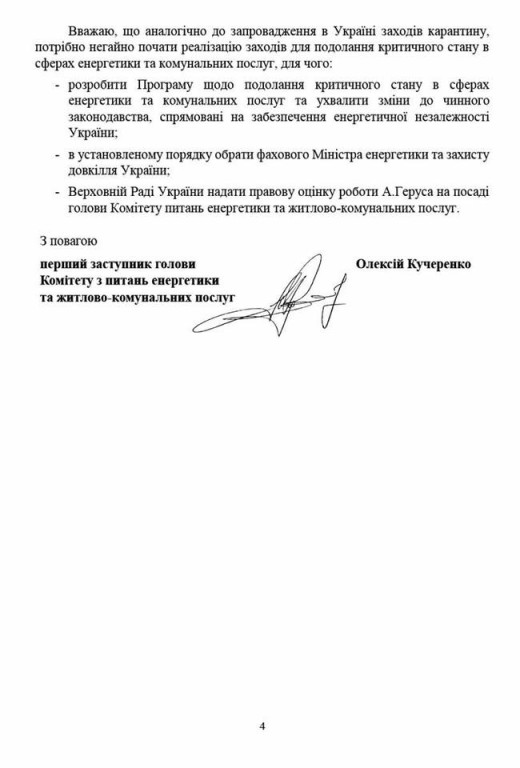 - Верховній Раді України надати правову оцінку роботи А.Геруса на посаді голови Комітету питань енергетики та житлово-комунальних послуг.