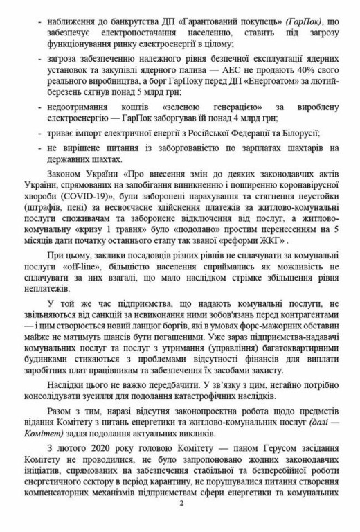 З лютого 2020 року головою Комітету — паном Герусом засідання Комітету не проводилися, не було запропоновано жодних законодавчих ініціатив, спрямованих на забезпечення стабільної та безперебійної роботи енергетичного сектору в період карантину, не порушувалися питання створення компенсаторних механізмів підприємствам сфери енергетики та комунальних послуг, врегулювання проблеми з «зеленими тарифами», яка спричиняє додаткові загрози енергетичній безпеці країни, тощо.