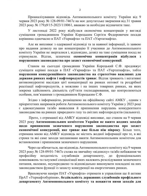Суміщення паном Сергієм Корецьким посад керівника Укрнафти і Укртатнафти відбулося з порушенням конкурентного законодавства. Як на це відреагував Антимонопольний комітет України – повідомив мене, що заява про надання такого дозволу до АМК не надходила і в майбутньому Комітетом будуть вжиті, заходи якщо порушення таки буде встановлено.