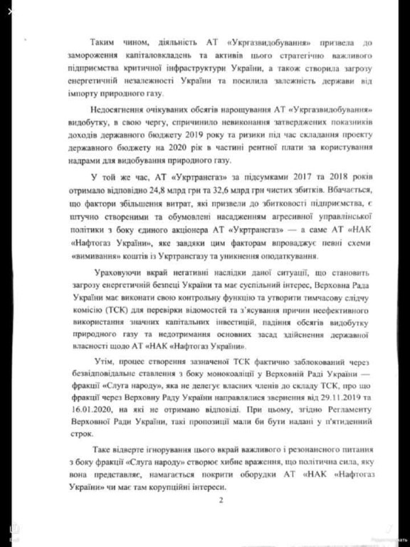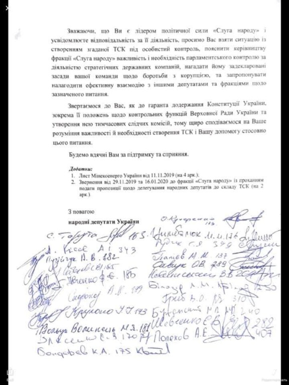 «Зважаючи що Ви є лідером політичної сили «Слуга народу» і усвідомлюєте відповідальність за її діяльність, просимо Вас взяти ситуацію із створенням згаданої ТСК під особистий контроль, пояснити керівництву фракції «Слуга народу» важливість і необхідність парламентського контролю за діяльністю стратегічних державних компаній, нагадати йому задекларовані засади вашої команди щодо боротьби з корупцією, та запропонувати налагодити ефективну взаємодію з іншими депутатами та фракціями щодо зазначеного питання», — йдеться у зверненні народних депутатів.