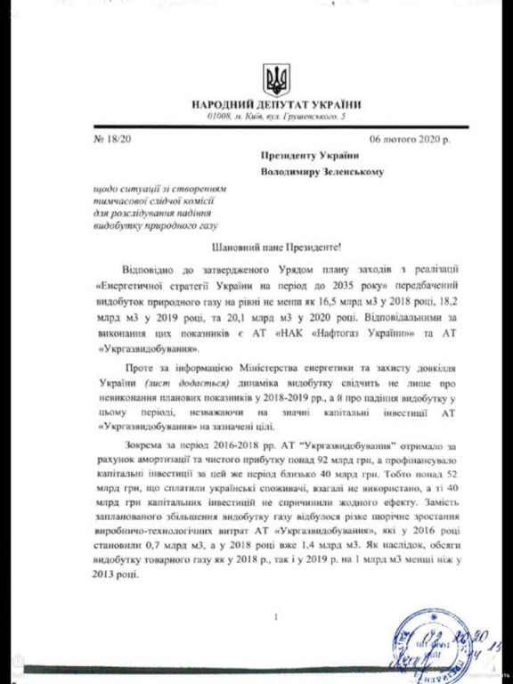 Понад 20 народних депутатів звернулися з відкритим листом до Володимира Зеленського щодо ігнорування керівництвом партії питання створення тимчасової слідчої комісії (ТСК) щодо розслідування діяльності НАК “Нафтогаз України” та падіння обсягів видобутку газу.