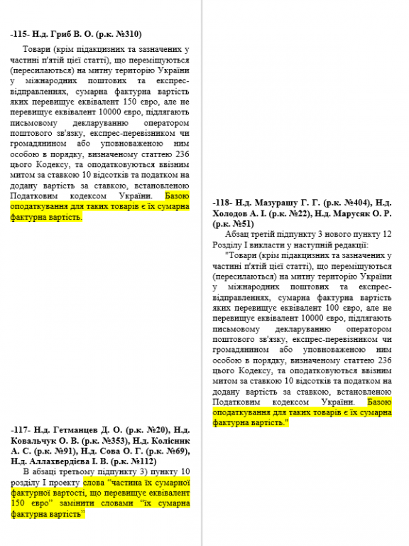 Йдеться про законопроекти 4278 та 4279, які передбачають приведення безподаткової вартості та митного ліміту міжнародних експрес-відправлень до єдиного показника у 150 євро, а також упроваджують електронні реєстри для митного оформлення таких відправлень. (Зараз нараховується ПДВ у розмірі 20% на суму перевищення ліміту в 100 євро та 10% мита від суми перевищення ліміту у 150 євро.)
