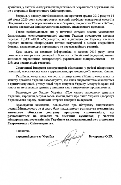 Зокрема, у даному листі зазначено, що протягом грудня 2019 року та 14 діб січня 2020 року спостерігається значний профіцит електричної енергії в Об’єднаній електроенергетичній системі України, що досягав 39 млн. кВт*год, а також наводяться інші аргументи на користь висловленого прохання.