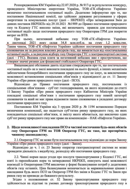 У документі йдеться про те, що НАК «Нафтогаз» досі не уклала договори з операторами ГРМ, що свідчить про порушення закону.
