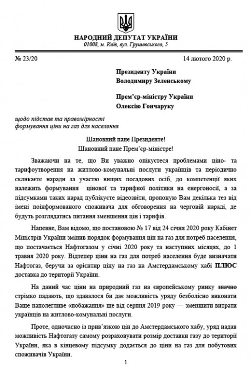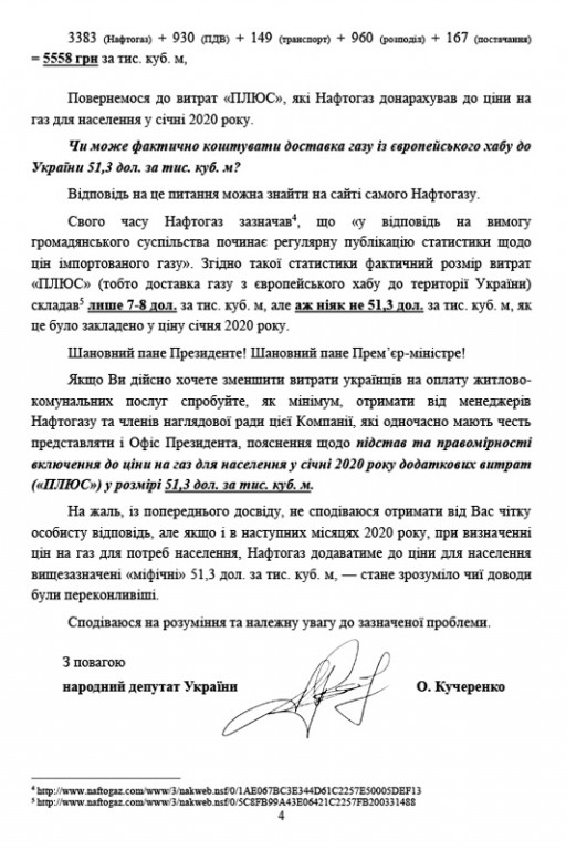 Народний депутат України Олексій Кучеренко звернувся до президента та прем’єр-міністра України стосовно того, що при застосуванні формули ціни «Амстердам+» Нафтогаз самостійно визначає «ПЛЮС», який додається до ціни на газ для населення.